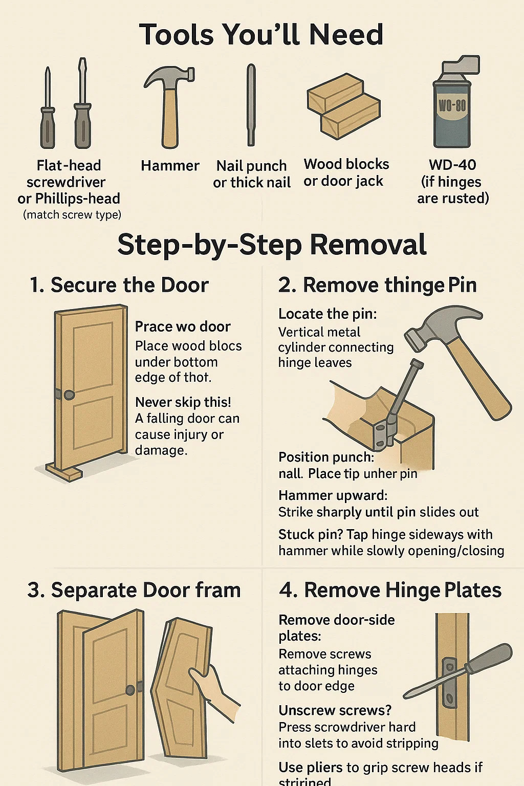 Zablokowana szpilka? Stuknij młotkiem zawias na boki, powoli otwierając/zamykając drzwi.