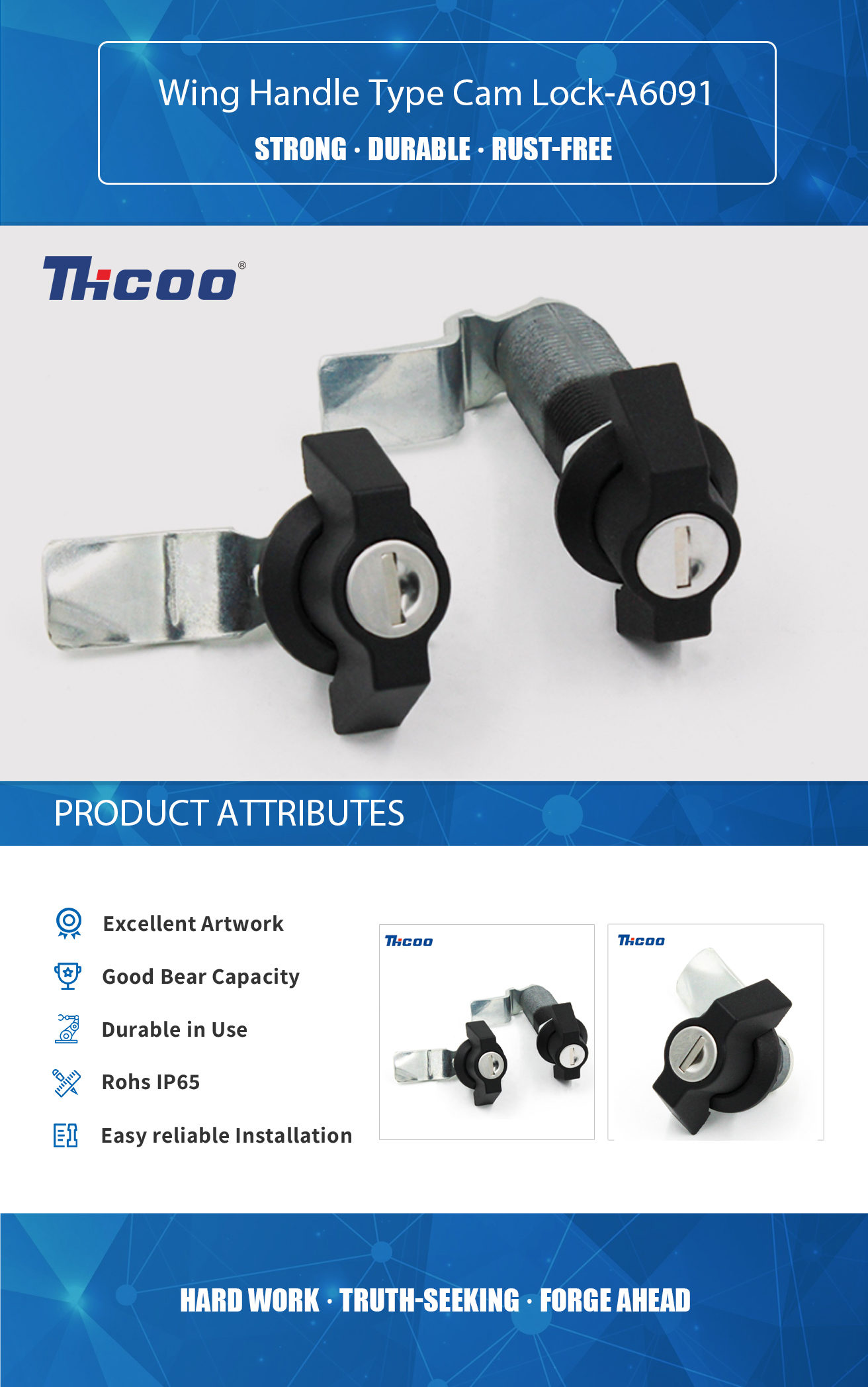 Posiadamy własne laboratorium testowe oraz zaawansowany i kompletny sprzęt kontrolny, który może zapewnić jakość produktów. Wing Handle Type Cam Lock-A6091 to głowica zamka dostarczana z ryglem. Posiada mały występ, który pasuje do dopasowanego gniazda w korpusie zatrzasku. To świetny sposób na bezpieczne przechowywanie rzeczy podczas podróży lub po prostu, gdy musisz zostawić je w samochodzie, gdy idziesz w miejsce publiczne.