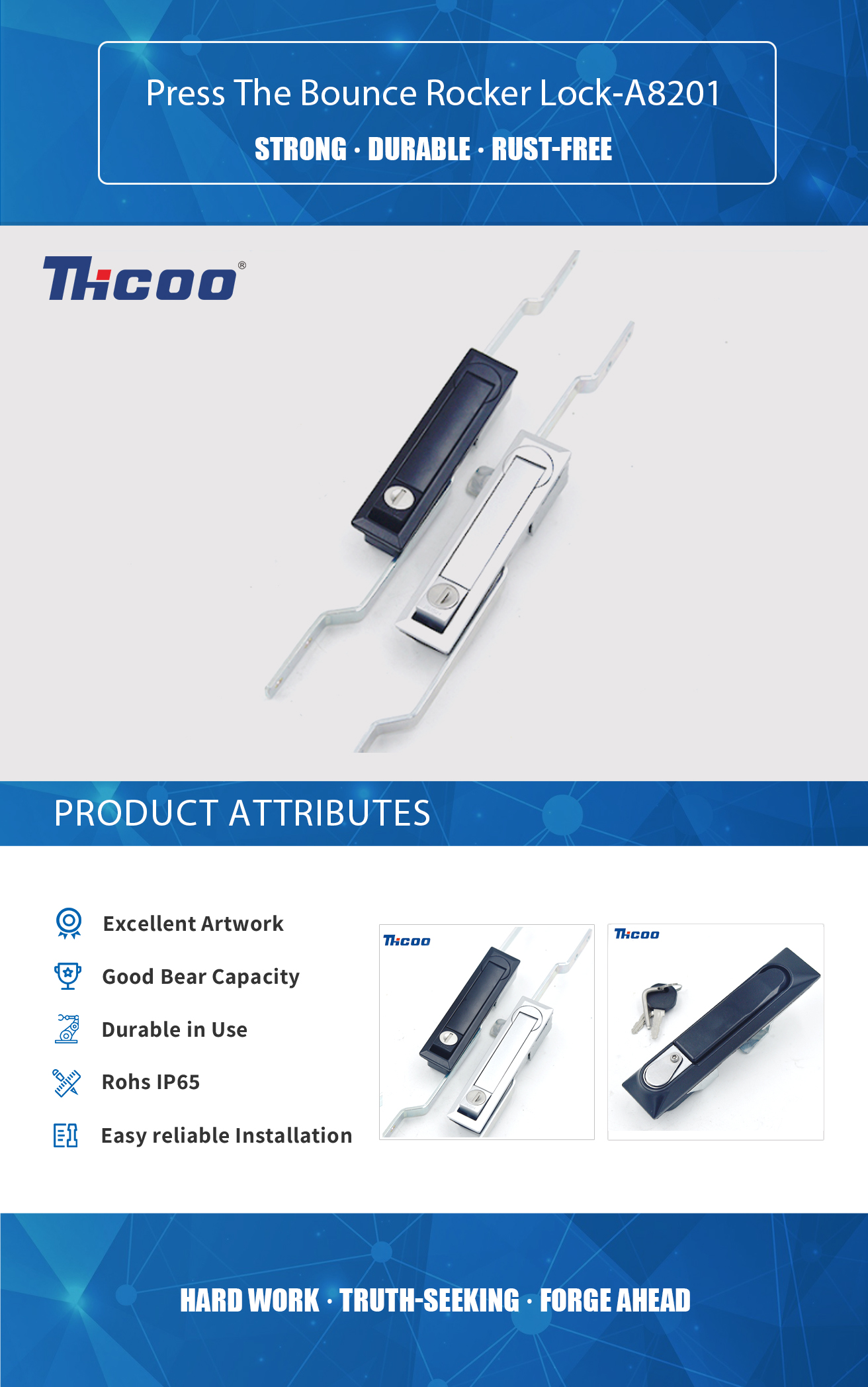 Posiadamy własne laboratorium testowe oraz zaawansowany i kompletny sprzęt kontrolny, który może zapewnić jakość produktów. Naciśnij Bounce Rocker Lock-A8201 są łatwe w użyciu, z prostym mechanizmem dociskowym, który wymaga minimalnego wysiłku do otwarcia. są zazwyczaj kompaktowe i lekkie, co ułatwia ich przenoszenie i instalację. Mogą nadawać się do różnych zastosowań, w tym do zastosowań mieszkaniowych, komercyjnych i przemysłowych.